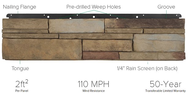 • Flat Panel: The main component of the Versetta Stone® system, the Flat panel covers two square feet and weighs approximately 17 lbs. Each panel is embedded with a G-90 galvanized nail strip that allows for easy installation with mechanical fasteners. The built-in rain screen and other moisture management features allow for proper water drainage.